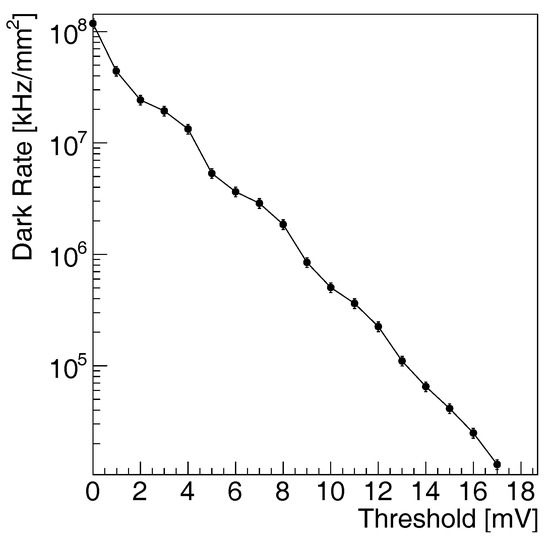 We measure the dark count rate by counting the number of avalanche signals produced in the SiPM sensor operated at the fixed bias voltage of 14 V, corresponding to 2 V above breakdown. The dark count rate is measured at room temperature and in dark conditions. The voltage amplitude of the signal of the SiPM is measured on a 50 load resistor. The output voltage is connected to a fast amplifier, based on a two-stage voltage amplifier obtained with the GALI 5+ wide-band monolithic chip [66]. The total amplification gain is adjusted to 10 with a voltage divider between the two amplification stages. The signal is sent to a threshold discriminator (CAEN N844). The number of pulses above threshold registered within a 1 s observation time window.