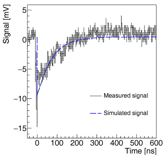 Figure 5 shows the measured signal corresponding to a single photon or to a thermally generated dark pulse. The signal exhibits a rise-time of approximately 120 ps and a characteristic recovery time of 67 ns. These timing properties are consistent with a quenching resistor of 250 k and a capacitance of approximately 0.3 pF. The corresponding simulated signal—estimated on a 50 load resistor, included in the simulation, and rescaled with the amplification stage used in the experiment—is shown in Figure 5 as a dotted blue line. The experimental observation is in agreement with the theoretical expectation. The impedance mismatch between diode, quenching resistor, and load resistor is responsible for the fast spike at the signal front in response to the fast quenching time. It is more pronounced in the data than in the simulation, because the parasitic capacitance is not included in the model.