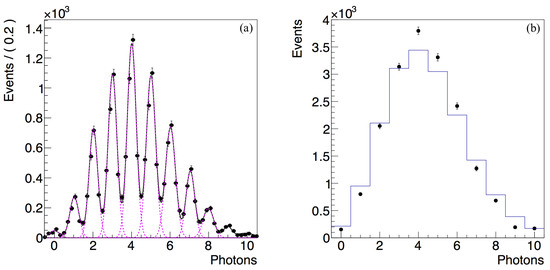 A second aspect of the spectrum in Figure 6a is that the area under each peak reflects the Poisson statistics of the photon detection in the SiPM structure and the contribution of the electronic noise. The average number of detected photons described by the Poisson distribution is calculated from the number of events of the pedestal peak and the total number of events N, applying the reconstruction formula under the hypothesis of a Poisson-distributed detected light: