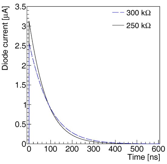 In order to study the effect of a change of the quenching resistor, we perform a transient simulation of the proposed structure using two sets of resistors, 250 k and 300 k. We report in Figure 7 the diode current corresponding to a single photon or to a thermally generated dark pulse. The current is flowing in the circuit composed of the diode, the bias source, and the quenching resistor. In both cases, the total charge contained in the signal is approximately electrons. The two signals have different peak amplitude, respectively 3 A and 2.5 A and decay time 78 ns and 93 ns. We conclude that a pixel-by-pixel non-uniformity of the quenching resistor does not affect the gain spread and the photon peak resolution, but has a negative impact on the overall time resolution of the detector.