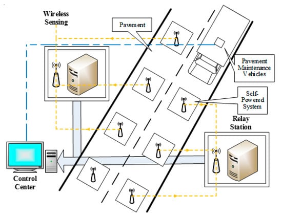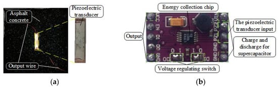 It is well known that roads produce pressure, deformation, and vibration when a vehicle passes []. The energy dissipated in the road to mechanical energy and heat not only destroys the road surface, but also causes problems for road maintenance. Piezoelectric smart materials [,,,] have received much attention in various fields because of the ability to convert mechanical energy into electrical energy. Smart pavement applications of piezoelectric smart materials on the road to transform mechanical energy into electricity is an emerging infrastructure. With the development of science and technology, the power demand for small electronic devices (such as wireless sensors) is drastically reduced [], making it possible to collect environmental energy for their power supply []. Therefore, electrical energy generated by smart pavements could apply to small electronic devices. There have been some studies on road piezoelectric and microelectronics wireless sensing but as far as we know, there are as yet no related articles on pavement piezoelectric, adaptive data acquisition, and wireless sensing.