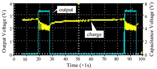 The situation of the vehicle is random and disorderly and the type of vehicle on the road that determines the mechanical energy that is input to the system is also random, so the use of piezoelectric transducers to convert energy will not be regular, so the charge time required for the super capacitor cannot be predicted. As a result, the wireless sensing system does not have enough energy to run in real time, which also causes the system to shut down and fail to periodically send data based on the timer. Therefore, we had better not need to consume power to achieve the purpose of judging the collection of energy, and to power the data acquisition and wireless transmission module periodically according to the adaptive power knob. We need to calculate the supercapacitor capacity to indirectly match the energy consumed by the wireless sensing system. In Figure 4, we assume that the load is 100 Ω, using two 1F super capacitors in the series to charge and discharge, showing the load power from the adaptive power supply, in which the blue line for the output voltage, the yellow line for the capacitor voltage across. As the capacitor voltage increases, the output voltage would stabilize to 3.3 V. After the capacitor voltage is reduced, the output is stable. After a period of discharge, the output is reduced to zero, and the supercapacitor is automatically charged. After about 58 s, the load would be powered again.