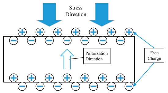 The basic principle of our energy harvest is the piezoelectric effect [,]. Specifically, it is a smart material that converts mechanical energy into electrical energy, which changes the electric field inside the material according to stress, as shown in Figure 5.