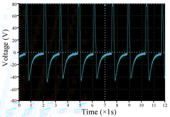Figure 6 shows the open-circuit voltage waveform of the smart pavement, point C in Figure 2. It is possible to see that there is no voltage before the wheel runs over piezoelectric transducer, and when the wheel is pressed, only a peak voltage of up to 80 V is generated within 200 ms. After the wheel is left, the voltage is 40 V peak voltage on the negative half axis, and the final voltage drops to zero. This spike voltage like the alternating current is not suitable for our energy storage unit and systems, so we need a circuit that allows this voltage to become direct current.