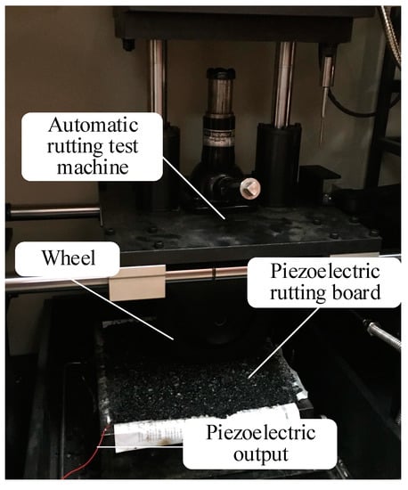 Aggregate, mineral powder, and asphalt are placed into a drought drying cabinet at 170 °C for two to three hours. Then, they are successively poured into the asphalt-mixing machine, in which the ratio of aggregate to asphalt is 4.6 to 5.3. The mixture is stirred at a constant temperature of 170 °C for 90 s. Next, asphalt concrete is placed into a plate specimen with 10 cm thick. Approximately half of the material is filled and flattened by hand. One piezoelectric transducer is placed on it. Fine asphalt is slowly covered in the piezoelectric transducer to avoid the stress concentration caused by large pieces of asphalt concrete. The remaining three-fifths of the material is placed into the rut plate specimen, and a piezoelectric transducer is placed on the top of it. The rest of the asphalt concrete is filled. Finally, the rutting board is placed into the rutting sample-forming machine. After adjusting the rutting board in the middle of the pressure bar, it is opened and pressed for 28 times. The pressed rutting board is cooled on the wooden frame for 12 h. The cooled rutting board is equivalent to a piezoelectric pavement. The rutting board is put into an automatic rutting test machine, with a rutting frequency of 0.7 Hz, a tire speed of 0.76 km/h, and a wheel pressure of 0.7 MPa. The finished equipment is shown in Figure 7.