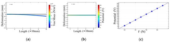 The mathematical model of the COMSOL Multiphysics analysis and the effect after 60 N stress deformation are shown in Figure 8a. In order to determine the surface potential of the piezoelectric transducer under fixed stress, static analysis is used, the left end of the displacement is constrained, and the right end of the external force is activated. The cantilever can be deformed, and piezoelectric transducer will produce electric charges. The potential distribution of piezoelectric transducer at 100 N stress is shown in Figure 8b. The potential of the piezoelectric transducer decreases from left to right, and the stress of the fixed end of the piezoelectric plate is the highest. The output voltage is simulated under the condition that the length of the piezoelectric transducer is known and that the pressure is changed. The simulation result is shown in Figure 8c.