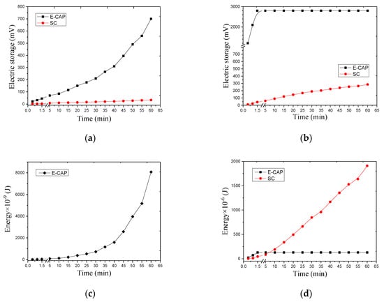 Figure 9d presents that the energy collected by the SC in 1 h is approximately 1.9 mJ and that by E-CAP is approximately 129 µJ. E-CAP no longer stores energy from 80 s, whereas SC energy harvesting presents a linear growth over time.