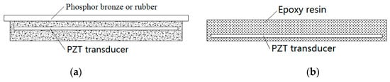 Given that rubber and phosphor bronze are difficult to be used to package piezoelectric transducers, asphalt sand is added. The packaging structure is shown in Figure 10a. The epoxy resin packaging structure has the same size as the rubber and phosphor bronze packages, as shown in Figure 10b.