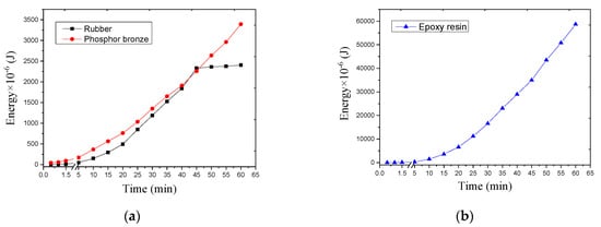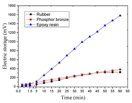 Figure 11 shows that the epoxy resin packaging material exhibits higher energy efficiency than rubber and phosphor bronze. Rubber and phosphor bronze present similar voltage output. However, after 45 min, the SC voltage of the rubber package no longer rises, and the output of the phosphor bronze as the packaging material is very stable.