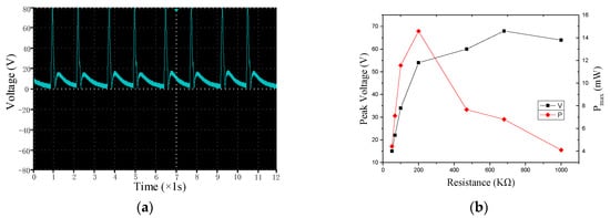 The voltage waveform in Figure 9b reveals that the piezoelectric transducer located on the surface produces a peak voltage of 23 V. When the oscilloscope is integrated into the capacitor, the SC voltage increases linearly with time, the voltage increases to 0.28 V in 1 h, and the E-CAP voltage increases to 2.8 V in 80 s.