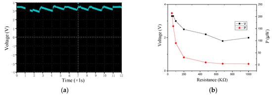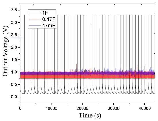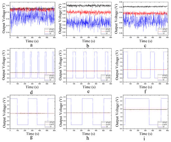 Figure 19 shows the output voltage at different capacitors and different loads. In the 47 Ω, 100 Ω, 150 Ω load under the three kinds of charging the capacitor in the energy collection circuit output could not output a stable voltage. In the case where the load is larger or equal to 200 Ω, a stable output at intervals could be used only when supercapacitor with a capacity of 1F is used. We calculated the interval stability of the output of the Ron, the value shown in Table 4.
