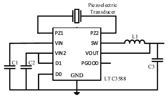 Active and passive circuits are studied to increase the charge collection efficiency. Among the mature passive circuits is the full bridge rectifier circuit [], but its efficiency is low. Active electric charge extraction circuits, such as synchronous electric charge extraction [], parallel-synchronized switch harvesting inductor [], series-synchronized switch harvesting inductor [,], and double synchronized switch harvesting [], are efficient. Due to the presence of the switch and the inductance, the output voltage of the piezoelectric device is controlled, the phase difference between the output voltage and the rate is reduced, and the output power is increased. However, energy collection is difficult owing to the need to generate a switching signal and thus drive the synchronous switch. Therefore, this study uses a passive full-bridge rectifier circuit. The LT3588 is used in this study as a charge collection circuit. The LTC3588 comes with a micropower full bridge rectifier and an efficient BUCK circuit with ultra-low quiescent current undervoltage lockout (UVLO) mode allowing charge to accumulate on the input capacitor until the buck converter can effectively transfer a portion of the stored charge to the output.
