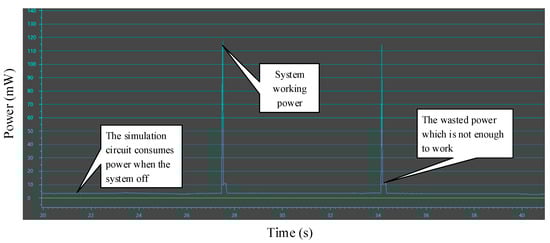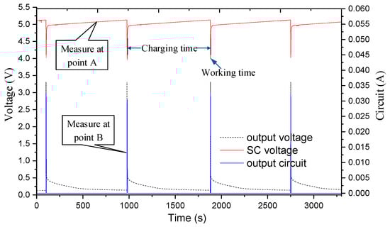 As shown in Figure 22, the wireless sensing system operates approximately 1055 s and the opening time is about 0.05%, so we charge according to 1F capacitor and observe the data on the host computer. To evaluate the performance of the power management module accurately, we measured the voltage and current of an hour at point A and point B, as shown in Figure 23.