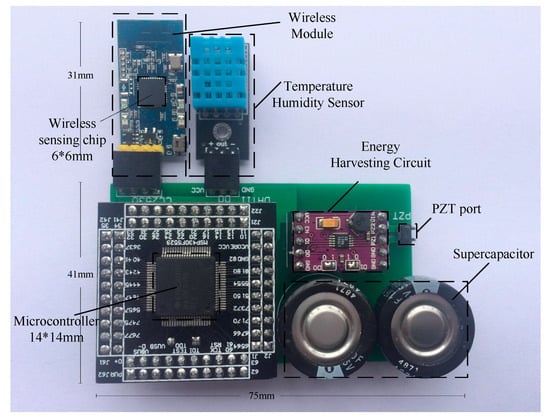 The wireless sensor in this paper is used for road data transmission []. The road data monitoring system is widely applied on the highway and consumes a lot of energy. The purpose of the system is to detect road disasters, find faults ahead of routine maintenance, and to avoid traffic accidents caused by road damage. There are already some cases of road health testing, for example Mohamed Rhimi et al. [] propose using wireless sensing technology and RF energy to drive wireless sensors buried under asphalt to transport asphalt data for the diagnosis of road health status. Guo et al. [] consider applying simultaneous wireless information and power transfer techniques to co-operative clustered wireless sensor networks, where energy-constrained relay nodes harvest the ambient RF signal and use the harvested energy to forward the packets from sources to destinations. However, the use of RF energy requires on-board RF readers to provide energy for power supply modules and the RF energy-receiving antenna is large in size and inconvenient to bury. Therefore, the use of road piezoelectric energy has become an efficient and convenient energy source. To this end, piezoelectric pavements should harvest enough energy to supply data acquisition and wireless transmission. Obviously, road data collection and other components should be embedded into the road and will be inaccessible for frequent maintenance. In fact, this sensor system can also access different sensors to apply to other information, e.g., road traffic flow [] or wheel tracking []. Therefore, a wireless sensing application for pavement energy harvesting is proposed in this paper.