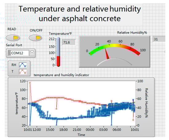 Our ePave enables self-powered detection of road information. Therefore, we collected asphalt concrete temperature and humidity information through the wireless sensing system sent to the host computer, do not need to go to the field of artificial measurements, which provides a big power to the road information detecting. Figure 24 shows the change in temperature and humidity of asphalt concrete in one day, and the change in the road traffic information could be used to calculate road health information, such as rutting. We measured about 24 h of system operation. The ePave is stable operation, with good data indicators.
