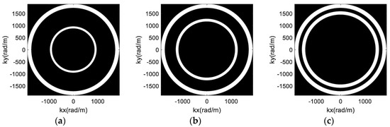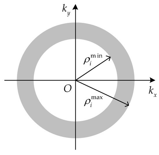 Denote the spatial wavenumber as . When a signal with wide bandwidth is used and the condition is satisfied, the two-dimensional spectral support of the ith antenna imaging is an annulus in Figure 2, and the radii are and , respectively. To obtain a better visual effect, only one annulus is displayed as an example in Figure 2, which represents the spectral support of one antenna. It can be noted that the spectral support of any other antenna is a similar annulus with a different radius.