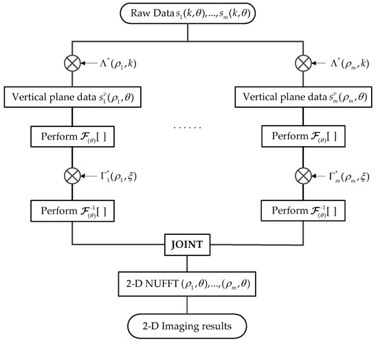 Therefore, the target function in the polar spatial frequency domain can be obtained from the inverse transformation . Then, the imaging result with high resolution can be achieved through the joint NUFFT processing of . Moreover, the flowchart of the modified imaging algorithm for the proposed imaging method is illustrated in Figure 3.