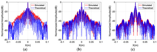 In addition, the theoretical PSF according to Equation (6) is also calculated, and is shown in Figure 7. It can be seen from Figure 7 that the main-lobes of the simulated PSF and the theoretical PSF almost have the same width, despite the different distribution of the antennas. Additionally, the side-lobes of the simulated PSF and the theoretical PSF are more similar when the spectral support is more intense. Thus, the effectiveness of the proposed imaging algorithm is validated.