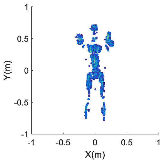 The reflection distribution of the human-scattering model used is displayed in Figure 9, which contains 3453 scatters with 0.005 m spacing. The imaging results of the three arrays are achieved in Figure 10. The image entropy of the three sub-images in Figure 10 are 11.7326, 12.9384 and 11.9848, which indicate that the array optimization procedure leads to better image quality. Moreover, it can be seen from the imaging result in Figure 10a that the profiles and details of the human model are quite clear. Thus, the proposed new imaging scheme can be used for security inspection.