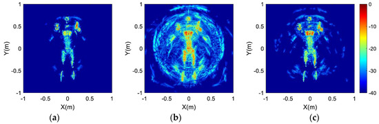 Imaging results of the human-scattering model: (a) Optimized array; (b) Uniform array 1; (c) Uniform array 2.