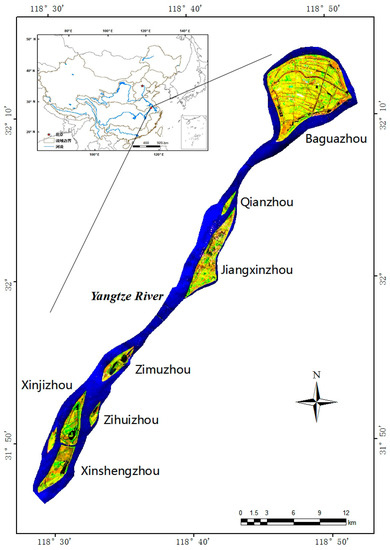 The Yangtze River (also known as the Changjiang River) is the world’s third longest river and the longest one in Asia. It flows from Anhui Province to Jiangsu Province. The Nanjing section is located in its lower reaches, between 118°22′–119°14′ and 31°14′–32°37′, for a total river length section of 95 km. The Yangtze River flows through central Nanjing from the southwest to northeast. Nanjing, which features a northern, subtropical monsoonal climate, lies in southeast of Jiangsu Province and the mean annual air temperature is 15.7 °C. Annual precipitation is 1106.5 mm [18]. The Qinhuai River and Chuhe River located south and north of Yangtze River, respectively, are two primary tributaries which flow through Nanjing. Most of the land along the river is classified as plains, specifically valley plains and lakeshore plains, where the agro type is dominated by yellow brown soil. The lower reaches of the Yangtze River in the Nanjing region, play host to many riverine islands. Because of sediment transport and deposition, tidal backwater and river tides, more than a dozen river islands with a variety of shapes and sizes appear in Nanjing section of Yangtze River (hereinafter referred to as NYR). They are shoals, washland, shallows and river islands, and their average elevation is four to seven meters.