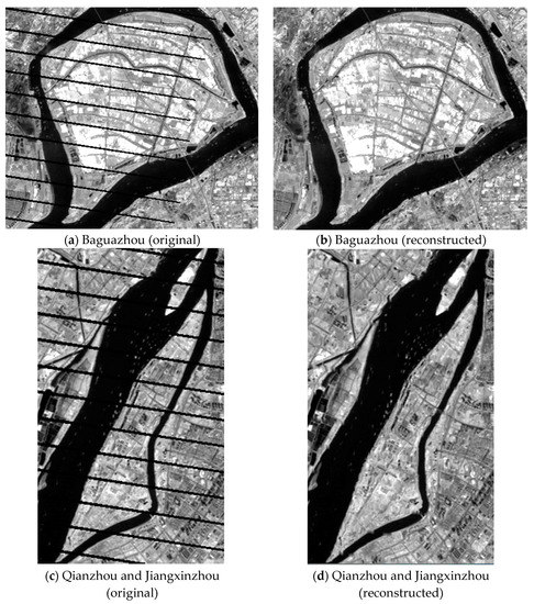 Sample Landsat 7 ETM+ SLC-off model correction effectiveness of 19 December 2005, images over (a,b) Baguazhou island and (c,d) Qianzhou and Jiangxinzhou islands.