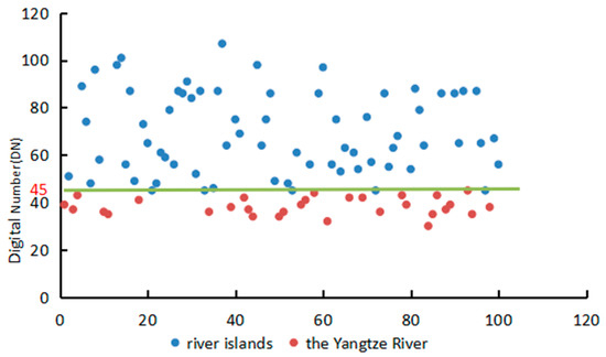 To ensure the value of , this study used the threshold value method, which applied the difference in the reflectivity of some bands between a surface feature and other background surface features. According to a priori knowledge of visual image interpretation and field confirmation, we randomly and uniformly selected 100 points from one image and judged whether they are land or not. Then we obtained an optimal threshold value of 45, which is the DN value of water and land demarcation (Figure 3). The threshold value method has a high effectiveness to extract water information based on the significant difference in the reflectivity between water and other objects.