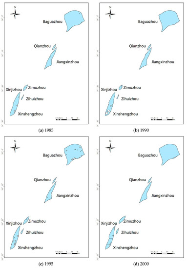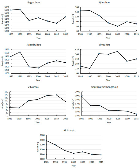 The images of river islands obtained after classifying and clustering are shown in Figure 4. Figure 5 is the calculation of these islands’ areas during 1985–2000. The largest island, Baguazhou, and the smallest island, Zihuizhou, have an average size of 5485 hm2 and 96.71 hm2 (1 hm2 = 10,000 m2), respectively. The islands listed in order of size, from largest to smallest were: Baguazhou, Xinjizhou (Xinshengzhou), Jiangxinzhou, Zimuzhou, Qianzhou and Zihuizhou. It should be noted that Xinjizhou and Xinshengzhou were linked together but divided into two river islands in 1998. So the areas of these two islands were grouped together for calculations.