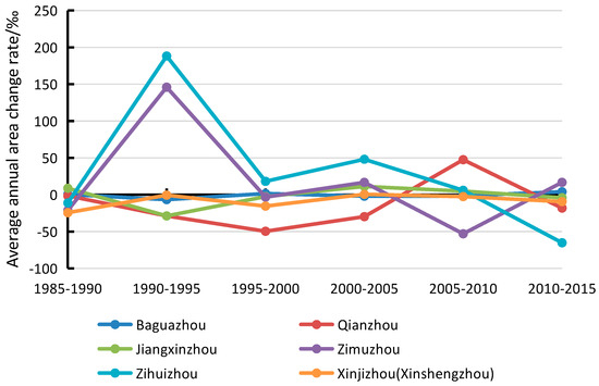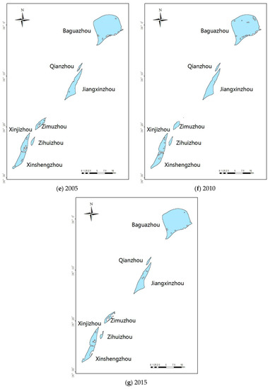 The annual average area change rate during the six-time periods are shown in Figure 8 by Equation (5). The largest magnitude of rate of area change occurred with Zihuizhou, which increased by 30.7‰ per year. The smallest island, Baguazhou, decreased by 0.66‰ per year. Listing the islands from largest to smallest, in order of the absolute value of each island area change rate were: Zihuizhou, Zimuzhou, Qianzhou, Xinjizhou (Xinshengzhou), Jiangxinzhou and Baguazhou. Disregarding Zihuizhou, each island area change rate tended towards zero, with time, suggesting a trend towards stability.