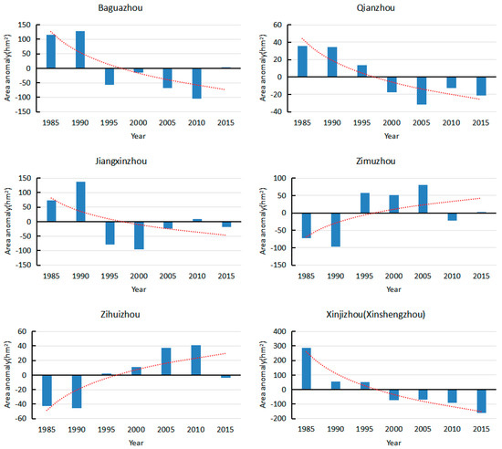 The trend of all islands’ area and each island’s area were calculated by Formula (4) respectively. The total area of the river islands in NYR clearly decreased during the 30 years (Figure 6). The area decreased faster during 1985–2000 and slower from 2000 to 2015. These islands presented a general decrease with a 30-year annual average area of 8975.14 hm2. The total area declined by an average of 19.97 hm2 a year. Every island’s area change can be seen clearly in Figure 7. The areas of Baguazhou, Qianzhou, Jiangxinzhou and Xinjizhou (Xinshengzhou) islands decreased, and that of Zimuzhou and Zihuizhou islands increased during the 30 years.