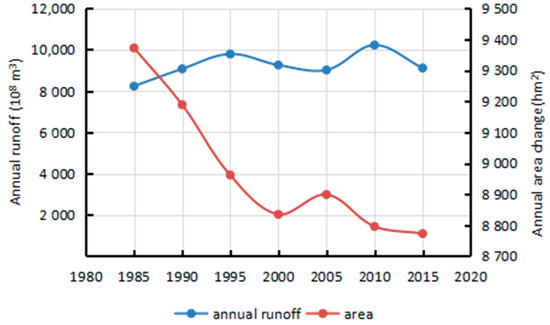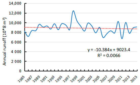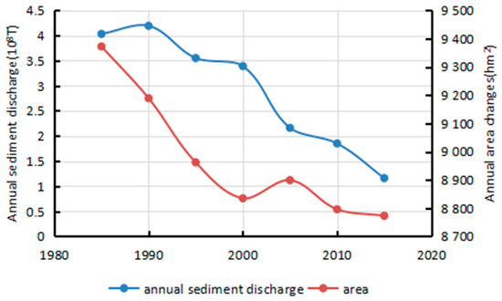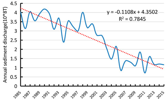 Rivers with high sediment loads experience annual migration rates that are higher than those of rivers with lower sediment loads [24]. This study processed the annual runoff and sediment discharge data during the period 1985–2015 as measured by the Datong hydrological station (Figure 13 and Figure 14). The average annual runoff in the 30 years was measured at 8857.29 × 108 m3 with a small decreased rate of 10.384 × 108 m3 per year. The maximum runoff of 10,354.77 × 108 m3 and minimum runoff of 6671 × 108 m3 were recorded in 1999 and 2011, respectively. The average annual sediment discharge in the 30 years was 2.62 × 108 T and decreased drastically by 0.1108 × 108 T per year. The maximum sediment discharge of 4.19 × 108 T was recorded in 1990, whereas the minimum sediment discharge of 0.718 × 108 T was measured in 2011. Associating with correlation analysis of influencing factors, sediment discharge is the main cause for the area decrease of river islands.