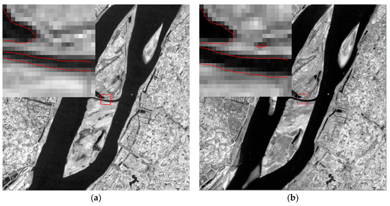 Before-and-after images of mid-channel between Xinjizhou and Xinshengzhou ((a) 7 February1998; (b) 19 December1999).
