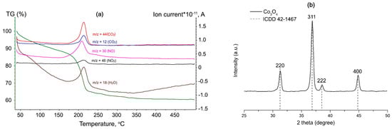 (a) TG-MS curves for of the dried precipitate; (b) X-ray diffraction patterns of Co3O4 nanoparticles.