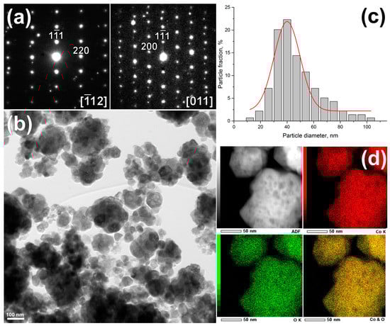 The microstructure of cobalt oxide was investigated by TEM (Figure 2 and Figure 3). The selected area ED (SAED) patterns were taken from single nanoparticles along 				  and [011] zone axis (Figure 2a) confirmed cubic Co3O4 spinel structure (Fd3m, a = 8.083 Å) determined by XRD and show perfectly crystallized structure. Since the size of selected aperture is slightly larger of single nanoparticle, other nanoparticles at the edge of the selected area aperture can contribute to SAED pattern resulting in appearance of extra spots. Figure 2b demonstrates that the sample consists of aggregated spherical particles with the broad size distribution from 15 to 100 nm. A size distribution was obtained from several TEM images from more than 150 particles manually and using the Image Pro Plus 6.0 software (Media Cybernetics Inc., Rockville, MD, USA). The mean particle diameter is 40 ± 7 nm (Figure 2c), which is in a good agreement with the average crystallite size Dcr calculated from XRD data. According to the EDX-STEM elemental maps shown in Figure 2d, oxygen and cobalt are distributed homogeneously within single particles.