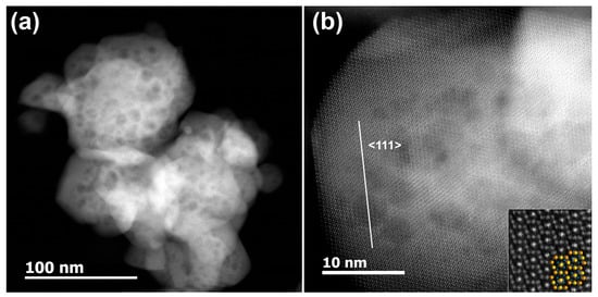 (a) Low-magnification and (b) high resolution HAADF-STEM images of Co3O4 nanoparticles viewing along the [011] zone axis. An enlarged image with overlapped structural model (Co—orange, O—blue) is given as inset.