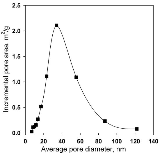From the HAADF-STEM image presented in Figure 3a one can clearly see that the prepared Co3O4 particles have a porous structure, with the mean pore diameter of around 3–7 nm due to the gases escaping during the decomposition process. However, it was determined by BET and BJH methods that the main contribution to the total surface area is made by pores with a diameter of 30–60 nm (Figure 4). This contradiction can be explained by the fact of agglomeration of the nanoparticles. In this case the pores with diameter of 30–60 nm are formed as a result of the contact between the particles in the agglomerates. The formation of agglomerates results in a low specific surface area of 8–13 m2/g. High resolution HAADF-STEM image of Co3O4 particle (Figure 3b) confirmed a good crystallinity of the material.