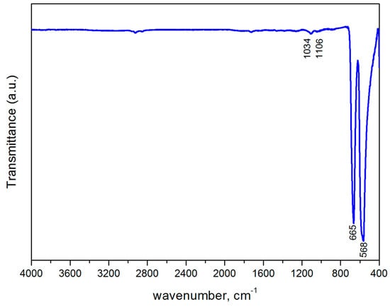 The FT-IR spectra of nanocrystalline Co3O4 is shown in Figure 5. In the investigated region (4000–400 cm−1), the obtained spectra manifest the presence of two absorption bands at 568 and 665 cm−1 which originate from the stretching vibrations of the metal-oxygen bond (Co3+-O and Co2+-O) and confirm the formation of Co3O4 spinel oxide [,,]. Peaks at 1034 and 1106 cm−1 are assigned to Co-O-H vibrations [].