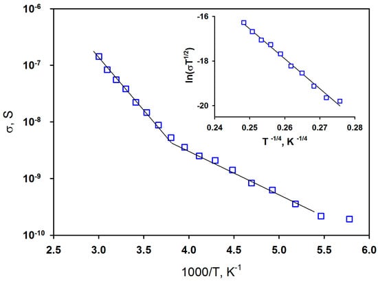 This process is dominating in high temperature region. The temperature dependence of the conductivity in the interval T < 0 °C is discussed in [] for Co3O4 films obtained by the CVD method. The authors assume that in this temperature range the conductivity mechanism has to be attributed to variable range hopping of holes (Mott VRH model []). Obviously, the data replotted in inset on Figure 6 as σT1/2 vs. T−1/4 demonstrate a linear relationship in the temperature range −100–0 °C that indicates the VRH carrier transport.