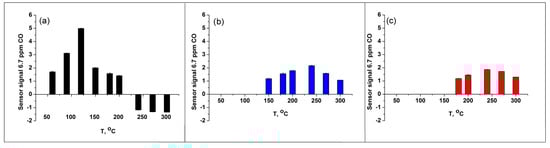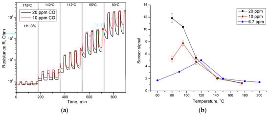 where  represent the reducing gas molecules in the gas phase,  is an atomic or molecular form of chemisorbed oxygen,  are the molecules of reaction products, e is an electron injected into the conduction band of the p-type semiconductor. With decreasing CO concentration, the temperature corresponding to the maximum sensor signal increases and is 80, 95, and 120 °C when detecting 20, 10, and 6.7 ppm CO, respectively (Figure 7b). Note, that at temperatures above 120 °C the sensor signal does not depend on the concentration of CO in dry air.