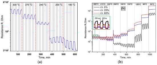An exceptionally interesting fact is the appearance of inversion of the sensor signal during CO detection in dry air in the temperature range T = 240–300 °C: the sensor’s resistance decreases in the presence of reducing gas in reversible increases in pure air (Figure 8a). The increase in air humidity leads to changes in the interaction of cobalt oxide with CO (Figure 8b). The most significant difference is the complete disappearance of the sensory signal at low temperatures. Thus, at a humidity of 20% r.h., the change in the sensor resistance in the presence of CO can be registered at a temperature of 150 °C, an increase in the relative humidity of up to 60% r.h. leads to an increase in this temperature to 180 °C. Another crucial point is that there is no signal inversion in humid air (Figure 8b). The comparison of temperature dependencies of Co3O4 sensor signal to 6.7 ppm CO at different humidity levels is presented in Figure 9.