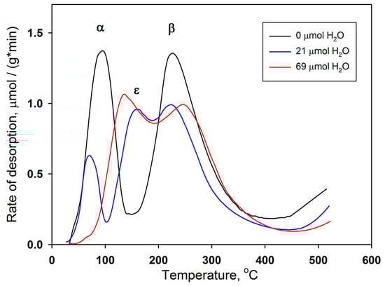 TPD curves of oxygen obtained after procedures consisting in oxygen adsorption after pre-adsorption of different quantity of water (0, 21 or 69 µmol/g Co3O4). Adapted from [].