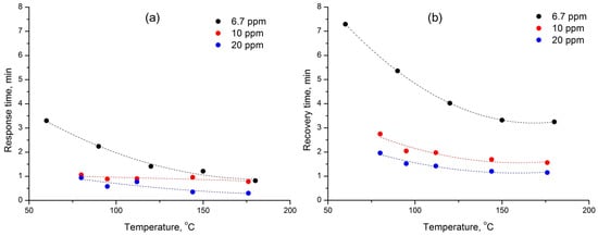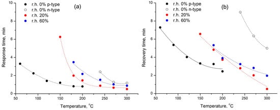 Values of response (a) and recovery (b) time as a function of temperature at 0% r.h.
