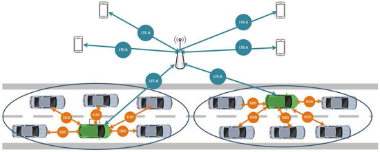 One feature of our proposal is that V-UEs are organized into clusters. Considering that clustering is a technique for grouping devices in the geographical vicinity to make the network more robust and scalable, it is very common in VANETs to find vehicles organized in clusters for deploying ITS applications. These clusters are usually defined based on some common characteristics such as vehicle movement, velocity, direction or transmission range, among others [27].