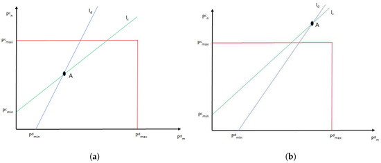 Moreover, from Figure 3 it is deduced that point A comprises the pair of minimum transmission powers that fulfill all the pairing constraints. Since the equations of and are Equations (11) and (12), respectively,