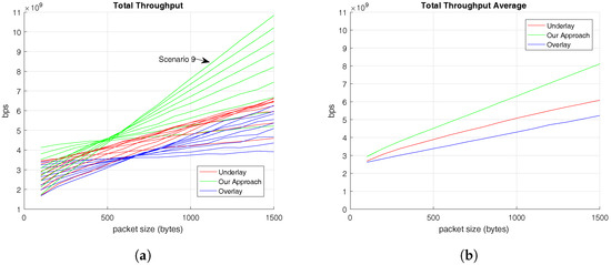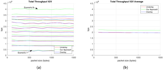 The aim of this discussion section is to summarize the meaningful results presented in the previous section. Regarding the throughput results, we could have validated that V-UEs’ throughput is independent of the C-UEs’ traffic pattern. This conclusion comes from the linear trend followed by the V-UEs’ throughput for all the different C-UEs’ packet size, as it is shown in Figure 4. In addition, the total throughput results provide evidence that the RRM we propose provides the highest values of total throughput, as it is presented in Figure 5.