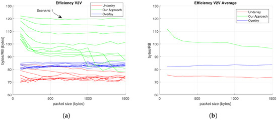 As it has been exposed in Section 1, the design of an efficient underlaying RRM for co-existing C-UEs and V-UEs users with minimal impact on cellular communications is a key problem. Therefore, we evaluate the previous metrics depending on C-UEs’ type of traffic, interpreted as the variation of transmitted C-UEs’ packet size. This variable allows to analyze how the V-UEs’ links performance depends on C-UEs’ traffic pattern.