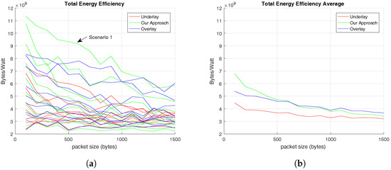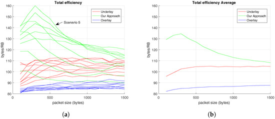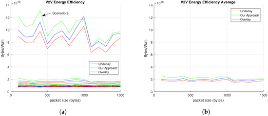 On the other hand, in Figure 6, the V2V’s efficiency results prove that the proposed methodology performs better when the number of V-UEs is high and that V2V’s efficiency is also independent of C-UEs’s traffic pattern. Additionally, the total efficiency results demonstrate that our approach is more efficient than the other alternatives, as it is demonstrated in Figure 7.
