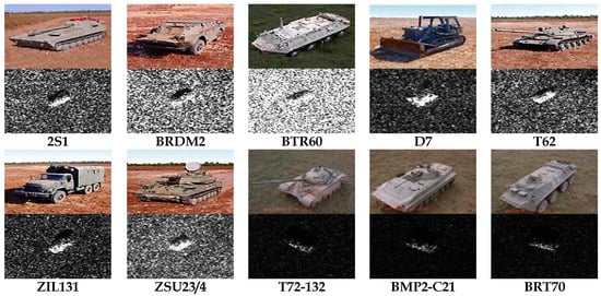 We first consider target recognition under SOC. Images acquired under operating condition of a 17° depression angle are used to train the mode, while the ones captured at an operating condition of a 15° depression angle are used for testing, as shown in Table 4. All ten targets are employed and their optical and SAR images are given in Figure 7. Among these vehicles, BMP2 and T72 have several variants with small structural modifications (denoted by series number). Only the standards (SN_9563 for BMP2 and SN_132 for T72) captured at 17° depression are available for training.