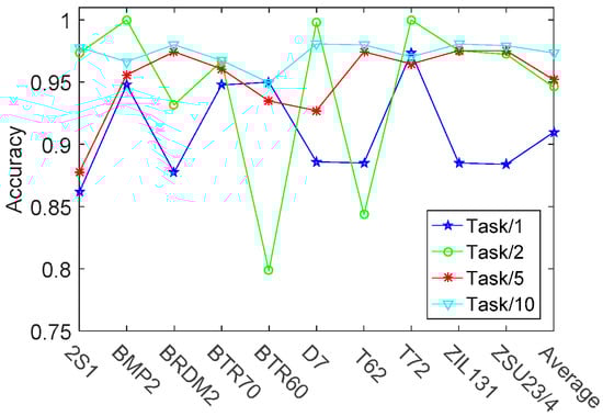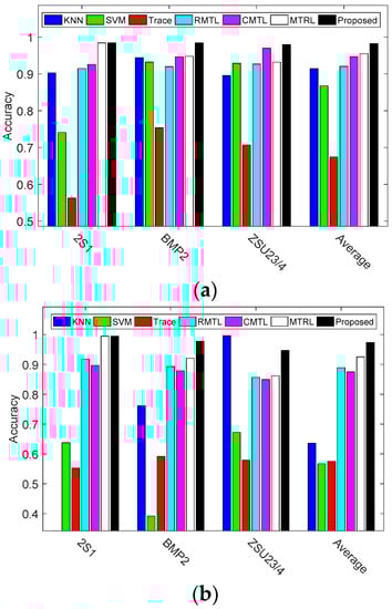 Although much work has been done on radar target recognition, two critical problems still exist. To our knowledge, most of the previous methods have been implemented in the framework of single-task learning. Although many sophisticated classifiers have been designed, they cannot make full use of the latent relatedness among multiple radar categories. Therefore, it is challenging to classify the targets with similar patterns by single-task learning methods. On the other hand, the acquired samples are usually limited or imbalanced, since large-scale and complete dataset collection is expensive. Single-task learning can’t realize information (common structures or parameters) sharing, which makes it difficult to train a model. On the contrary, multi-task learning can make use of multi-task relationships and thus help to improve the recognition accuracy. Dong et al. considered three components of monogenic signals as different learning tasks and proposed a joint sparse representation model to exploit the intercorrelation among multiple tasks for SAR ATR []. The contrast experiments have proven the superiority of multi-task learning.