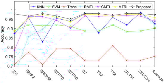 Figure 10 and Table 5 show the comparison ACC results of the proposed method and the reference methods. From Table 5, we can see that the overall recognition rate of our method is 0.9734, compared to 0.9584 for MTRL, 0.9391 for CMTL, 0.9209 for RMTL, 0.7504 for Trace, 0.9017 for SVM and 0.9271 for KNN. It is 1.50%, 3.43%, 5.25%, 22.30%, 7.17% and 4.63% better than the competitors, MTRL, CMTL, RMTL, Trace, SVM and KNN, respectively. The results show that jointly training the ten modes under a unifying classification framework is beneficial for the improvement of recognition rate. Besides, Figure 10 also shows that the ACC of target ‘2S1’ is lower than other targets in most of the reference methods. This may be because that, as shown in Figure 9, tasks ‘2S1’ and ‘BMP2’ are highly correlated and most of the reference methods can’t accurately describe and utilize this relationship, which results in a recognition performance degradation. On the contrary, the proposed method can utilize this relationship and get a better recognition accuracy.